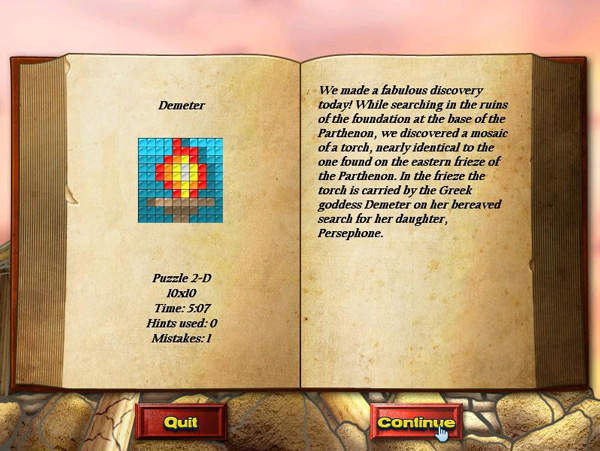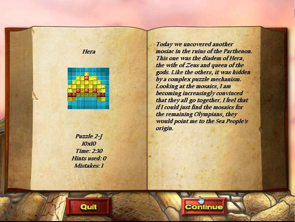 The high point of World Mosaics 6 was being able to move quickly from puzzle to puzzle. This is why I felt having to read the journal entries does a disservice, because it took away from the part that was most exciting. Unfortunately, even that excitement is short lived as there aren’t a lot of variations to the puzzles. I’m sure the puzzles get larger and more challenging, but for the most part, the gameplay remains the same.