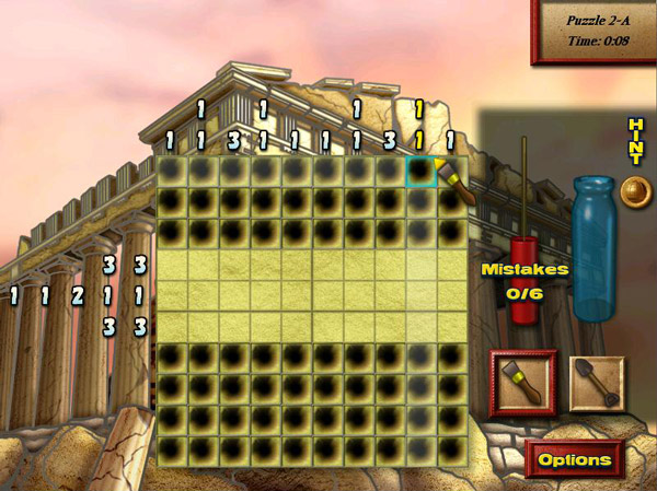 Armed with your trusty brush and shovel in your quest to catch a thief, you go around uncovering mosaics of artifacts and objects by solving puzzles. Each sweep of your brush uncovers a piece or row of the object, while the shovel marks the spots that aren’t a part of the picture.