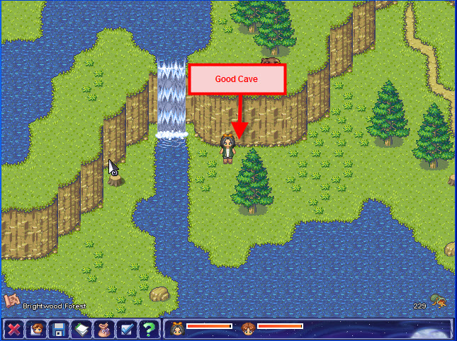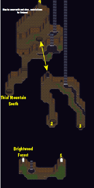 • After you've explored the Thial Mountains , and exit the furthermost southwest (#5 exit on map) cave exit, you'll enter a clearing into Brightwood Forest . You can attempt to explore Brightwood Forest at this time; however there isn't anything available and you wont' get very far. ( See Brightwood Forest Map)