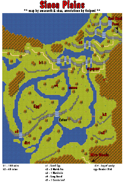 • Explore the Plains and locate 2 bags (1 bag well hidden in trees) and 5 chests while fighting monsters and searching for loot. You'll need to strengthen your party's levels before continuing much further. See Sinoa Plains map.