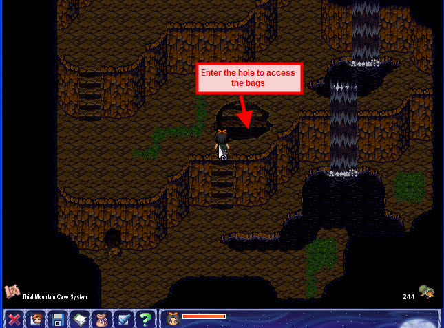• Explore the Mountains while locating 3 bags and 3 chests. Two of the bags are only available by going through caves. Use the map as a guide to travel west through the mountains and through the caves into Brighwood Forest before entering the city of Thias . Fight with as many monsters as you can to up your level.