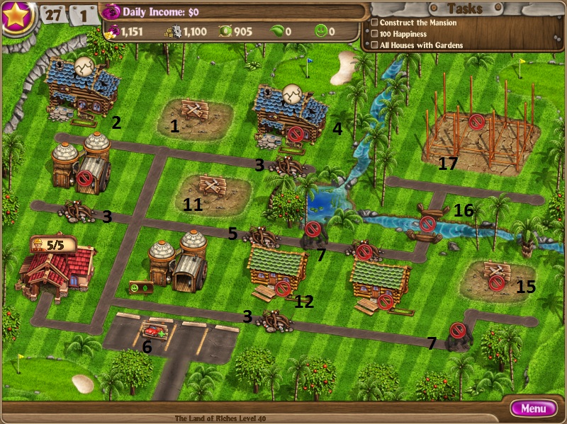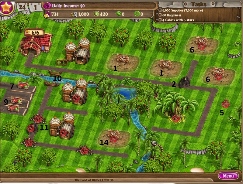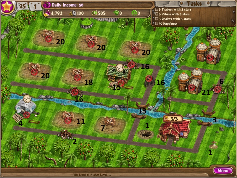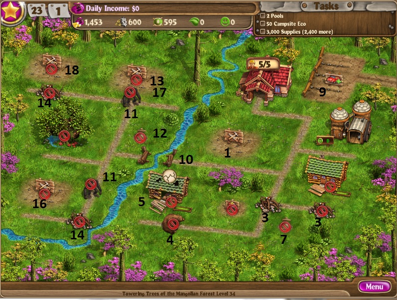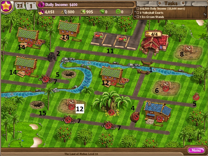 Build 2 cabinsScare off gorillaUpgrade cabinsRun factoryDig up treasureBuild 2 more cabins and upgrade themBuy one parking spaceRun factoryDo this twice more to get all 3 parking spacesBuild bridgeClear down the roadRun all factories as you can get to themHire a 7th workerBuild a poolHold an event as you finish up the supplies [/NUMBERED]