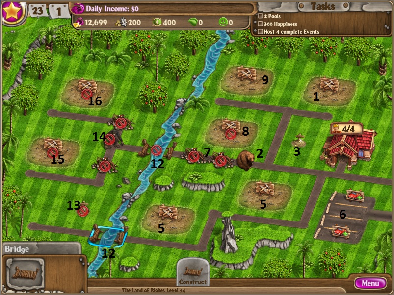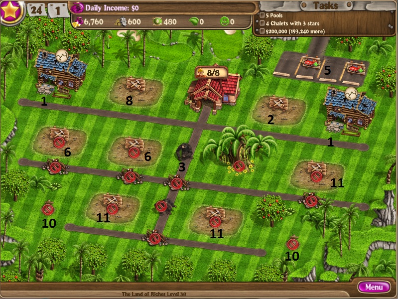 Repair chaletBuy the first parking spaceBuild first bridgeClear down the 2 roadsBuy the 2nd parking spacesRemove trees from 3 lotsBuild 2 factoriesBuild 1 tentBuild 1st poolHire 6th workerBuild 2nd poolBuild bottom bridge and clear to the treasure and dig it upBuild top bridge and clear to treasure and dig it upDestroy the factories when you have 2075.Build a pool and a tentHost 3 events [/NUMBERED]