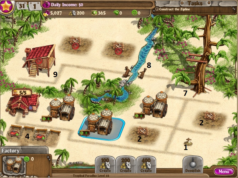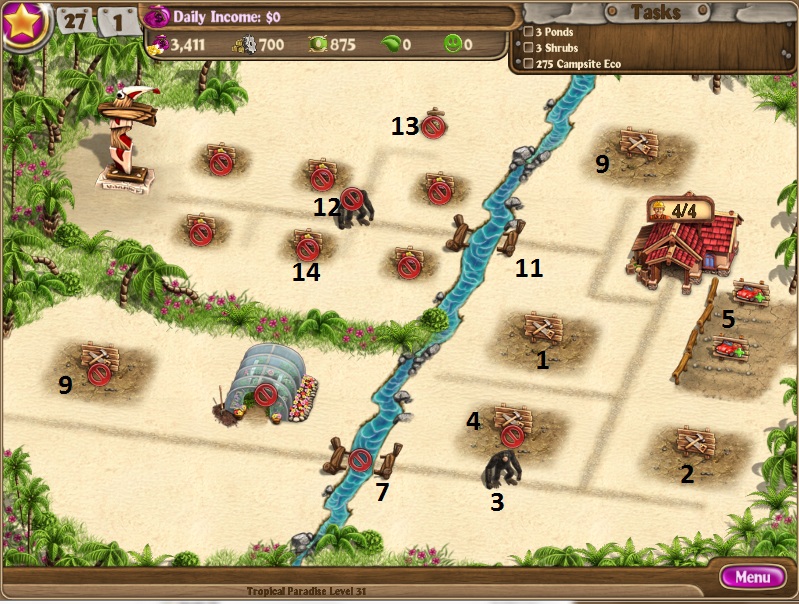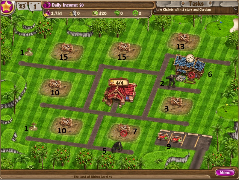Dig up treasure for $3000Build villa and upgrade twiceBuild factoryClear debris and top gorillaBuild 2nd chaletHire 2 workers to 7Build 3rd chaletScare 2nd gorillaUpgrade all 3 chalets to 3 starsHire to 8 workersBuy parking spacesClear debris to the bottomBuild 3 greenhousesDestroy factory and build greenhouseSend workers to riverKeep hiring workersSend workers to tree while keeping enough to buy seedsKeep hiring workers to 16Build gardens at 3 villas gradually[/NUMBERED]
