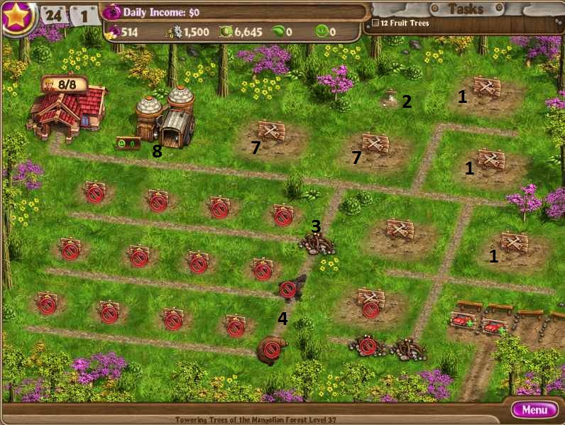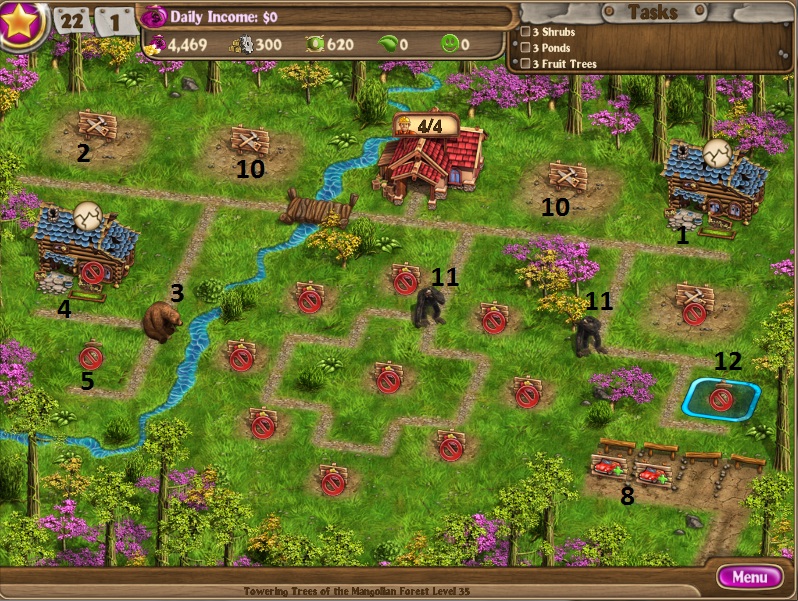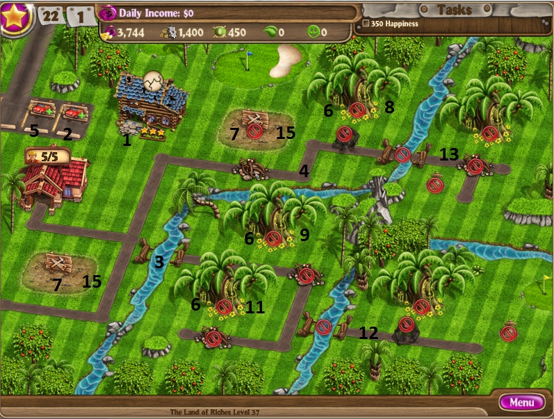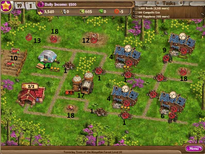 Clear debrisBuild factoryRepair cabinsClear obstructionsDig up treasuresRepair the chaletsUpgrade the chaletsHire 3 more workersBuild 4th chalet and 3 cabinBuild a greenhouseHire 4 more workers to 11Keep upgrading while buying seedsBuild gardens on all houses [/NUMBERED]