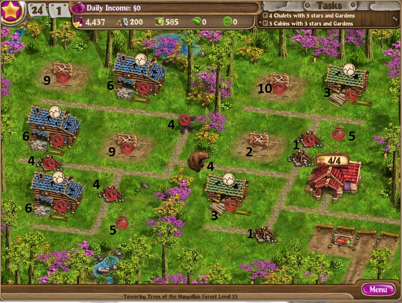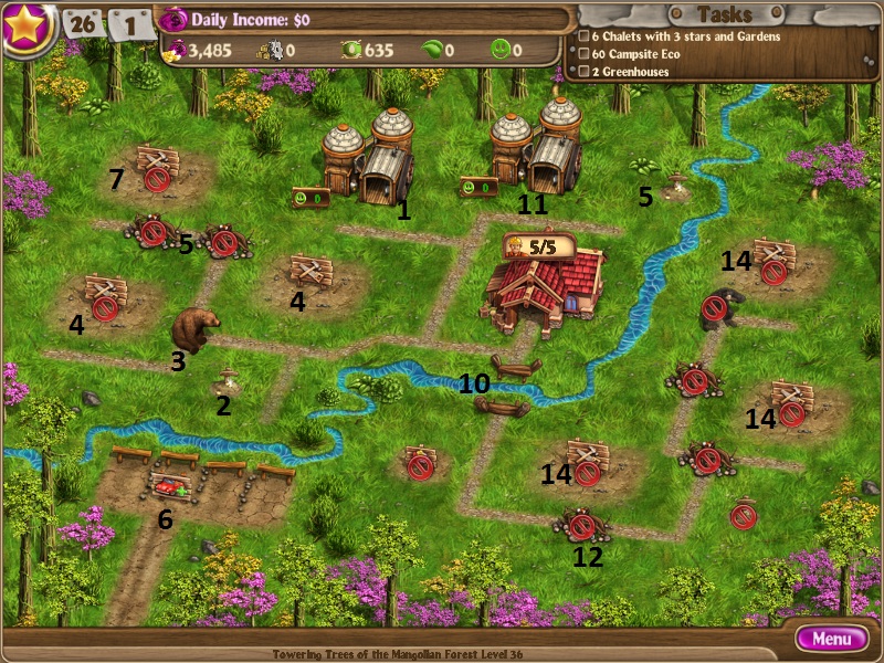 Repair 2 chaletsRun factoryScare bearUpgrade 2 chalets to 3 starsBuy parking spaceHire 6th workerClear debris and dig treasureBuild 3rd chalet to 3 starsBuild greenhouseKeep making suppliesBuild 2nd greenhouseBuild 2 treesBuild bridge for 5000Build 3 pondsHire workers throughout (need 12) [/NUMBERED]