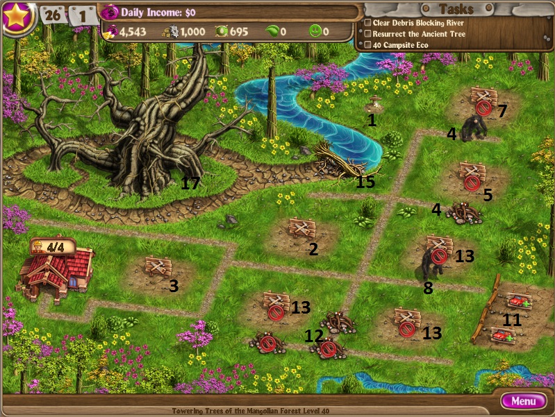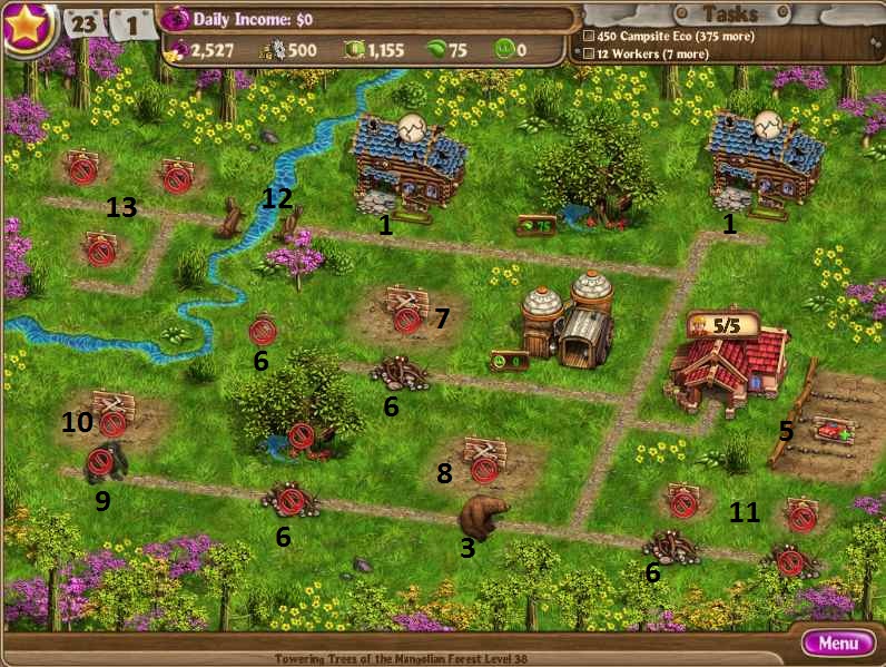 Run all 3 factories and spend all your moneyDig up treasureBuild 2 chalets to 3 starsBuy 2 parking spacesRun all 3 factoriesStart buying workers as you are running factoriesStart in on the tree with about 4 workersBuild bridge for 500 suppliesStart in on other side with a couple workersThen start alternating workers until both areas are full.If you want to just do one side at a time, you can do so by filling up the tree first, then building the bridge so that you are ready to move from the first area when it is finished directly to the second area. [/NUMBERED]