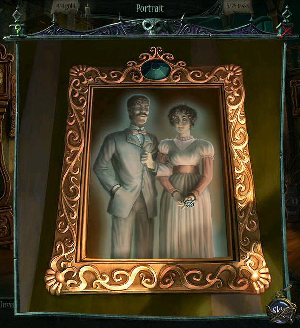 - Zoom in on the portrait hanging next to the grandfather clock.