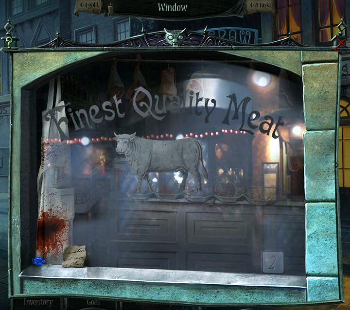 - Zoom in on the butcher shop window.