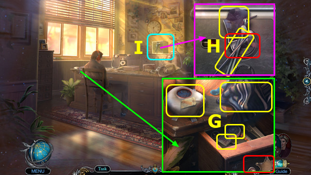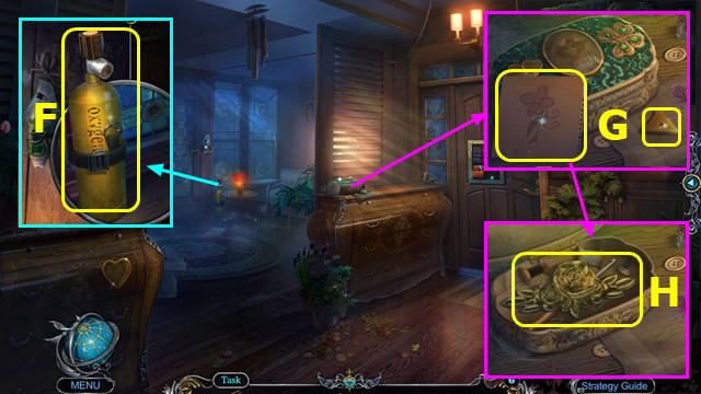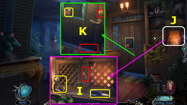 - Place FISH EMBLEM; take DOOR HANDLE and HOOK (H).