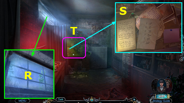 - MAGNIFYING GLASS, UV FLASHLIGHT, and COLORED GLASSES on BOOK; take SECRET NOTES.
