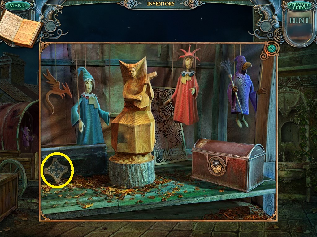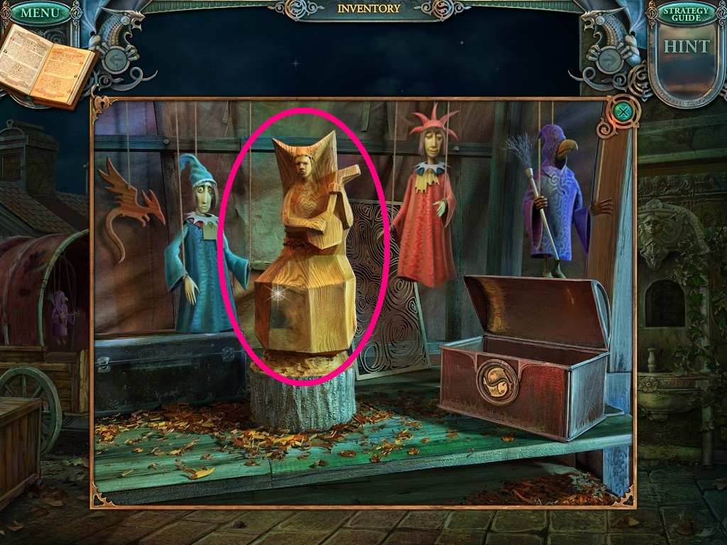 - Use the carving knife from the inventory to carve the wooden figurine (pink circle).