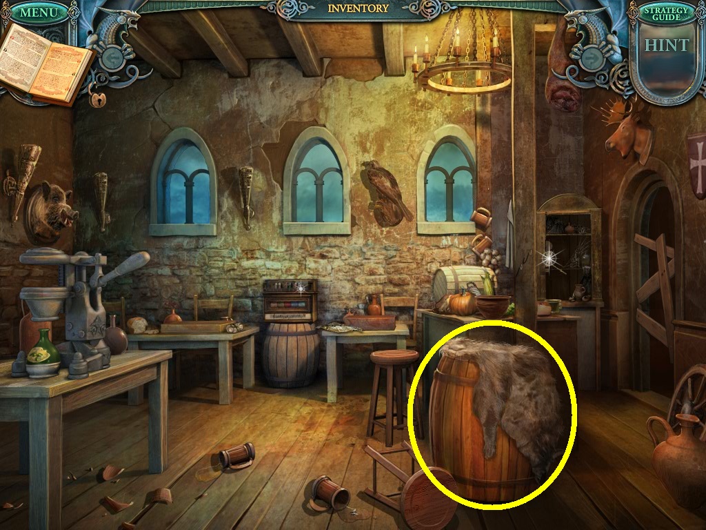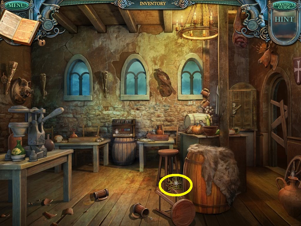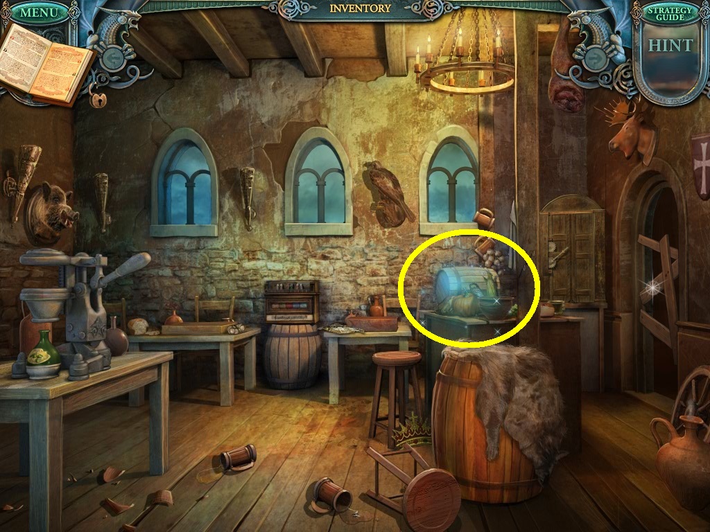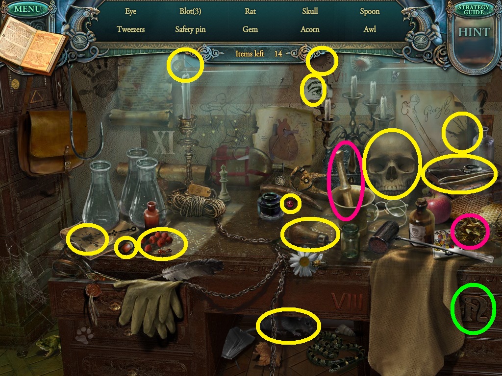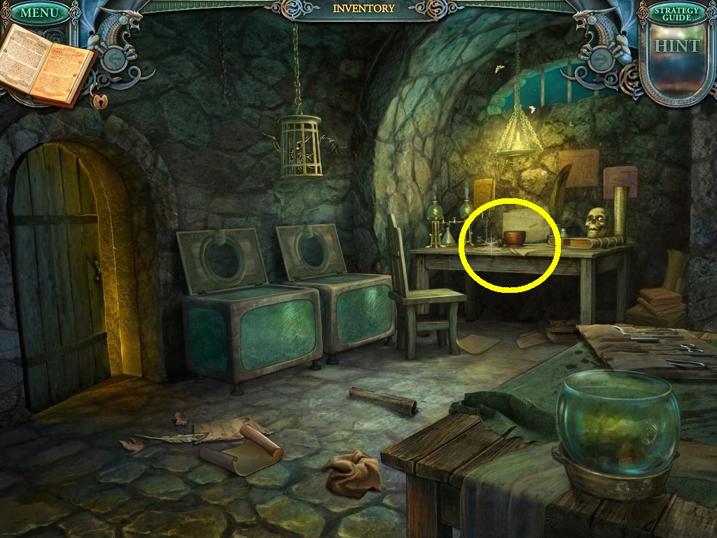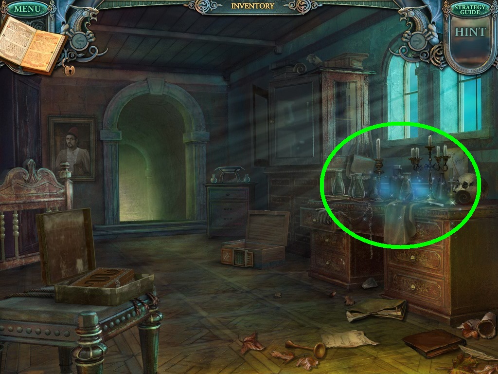 - Click the area over the desk in the apothecary to find the hidden object scene.