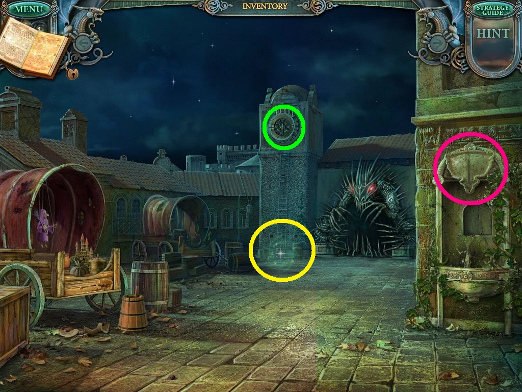 - Use the fountain pieces in your inventory to complete the plaque above the fountain (pink circle).