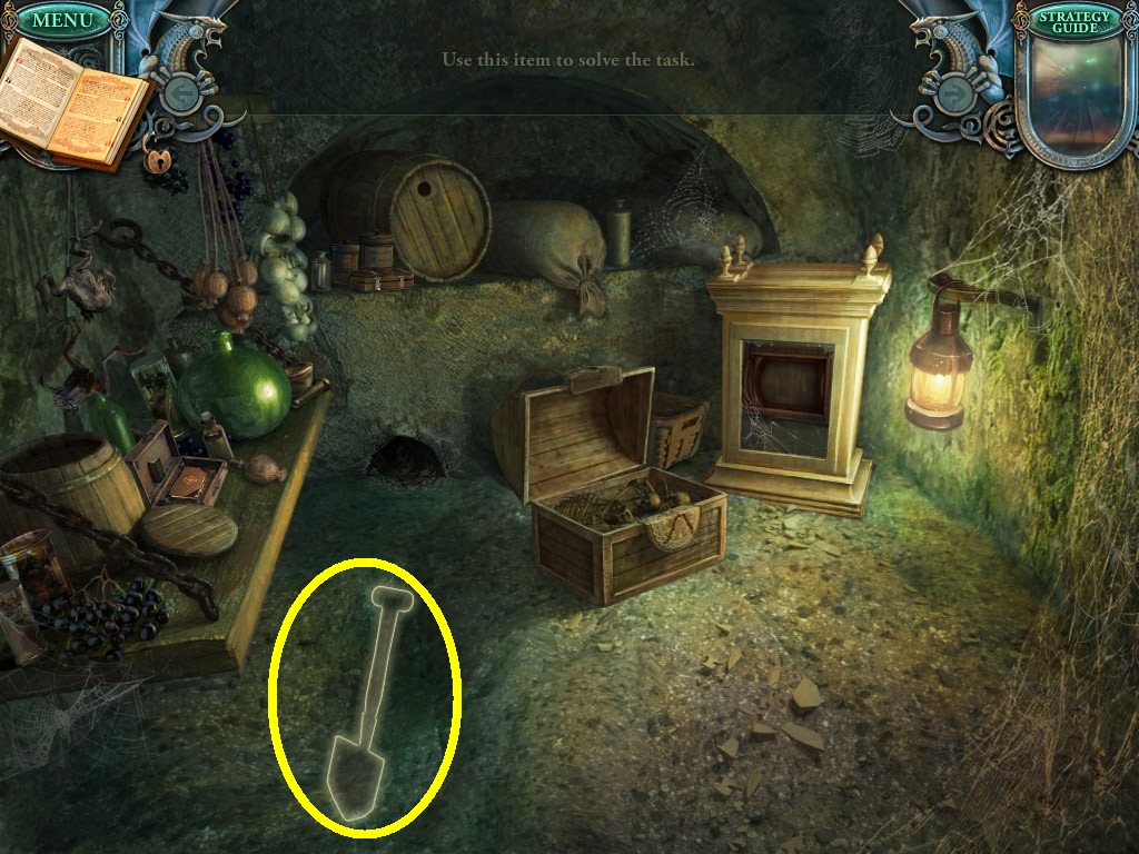 - Use the spade from the inventory to dig the floor (yellow circle).