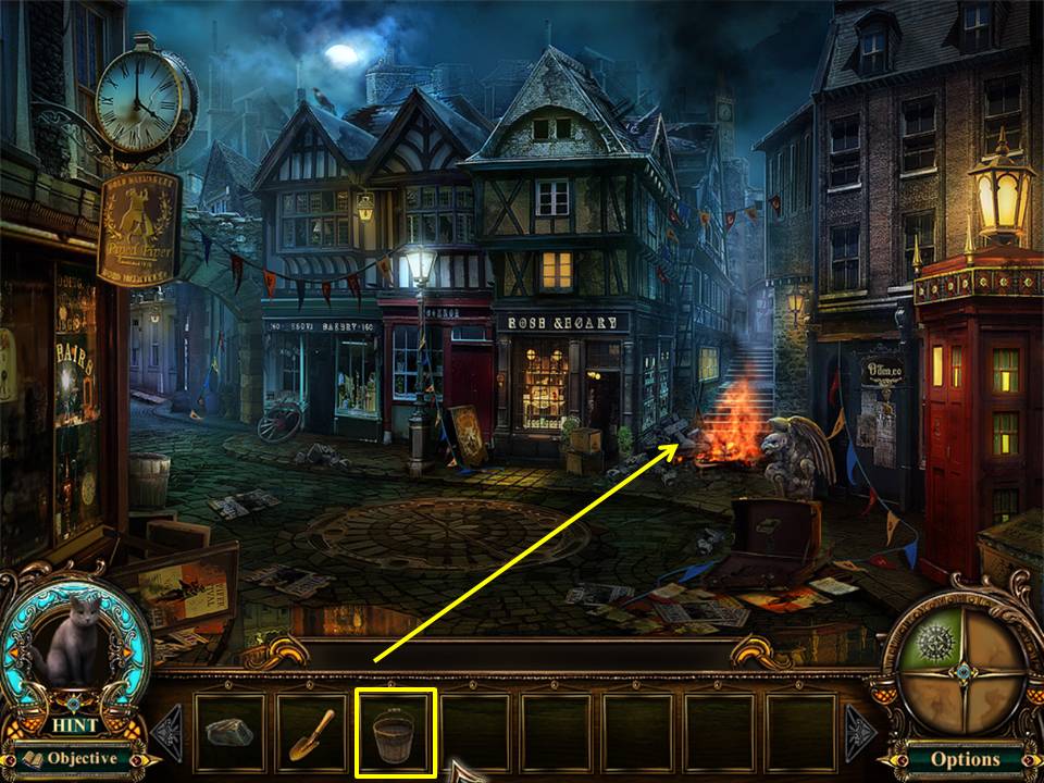 - Douse the flames with the BUCKET OF WATER.
