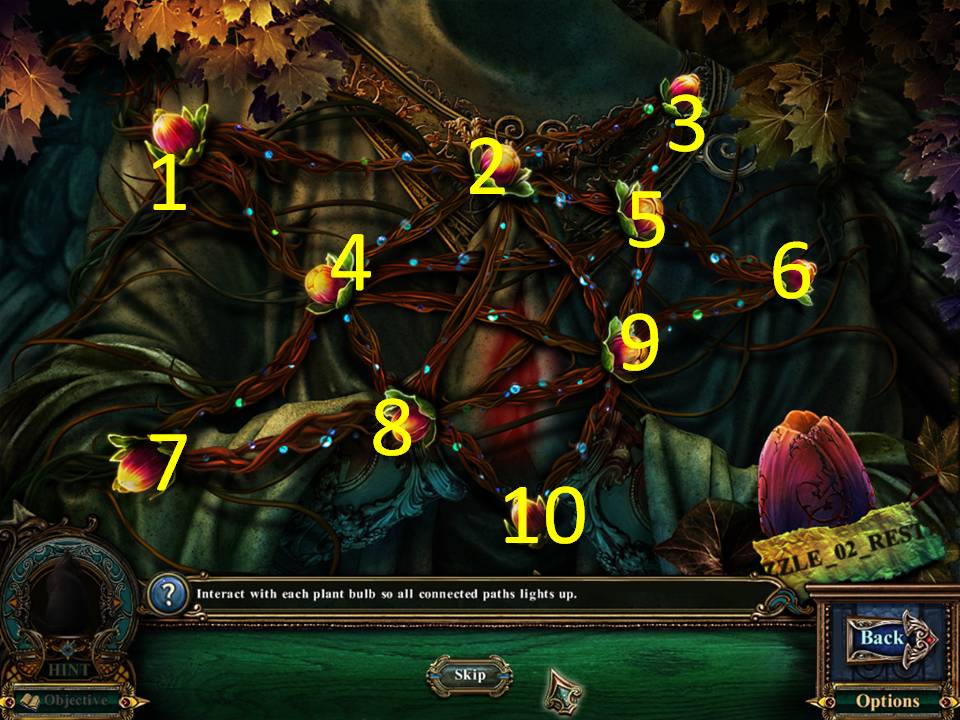 - Assuming the buds are numbered 1 to 10, from left to right, click in this order: 4, 8, 7, 4, 1, 2, 4, 5, 2, 3, 5, 6, 9, 2, 8, 10, 9, 8, 5, 9, 4.