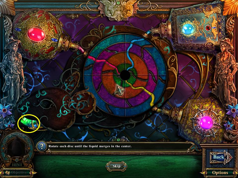 - The object of the game is to rotate each disc until the liquid merges in the center.