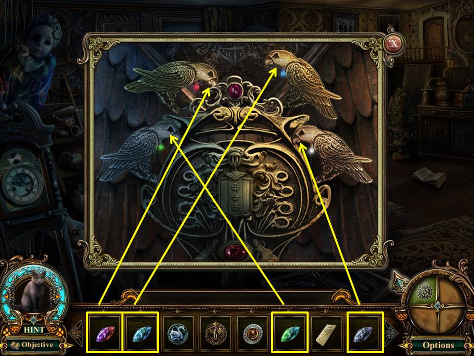 - Place the CRYSTAL EYE, JADE EYE, RUBY EYE, and SAPPHIRE EYE into the eyes of the four birds with the corresponding color stone on their neck.