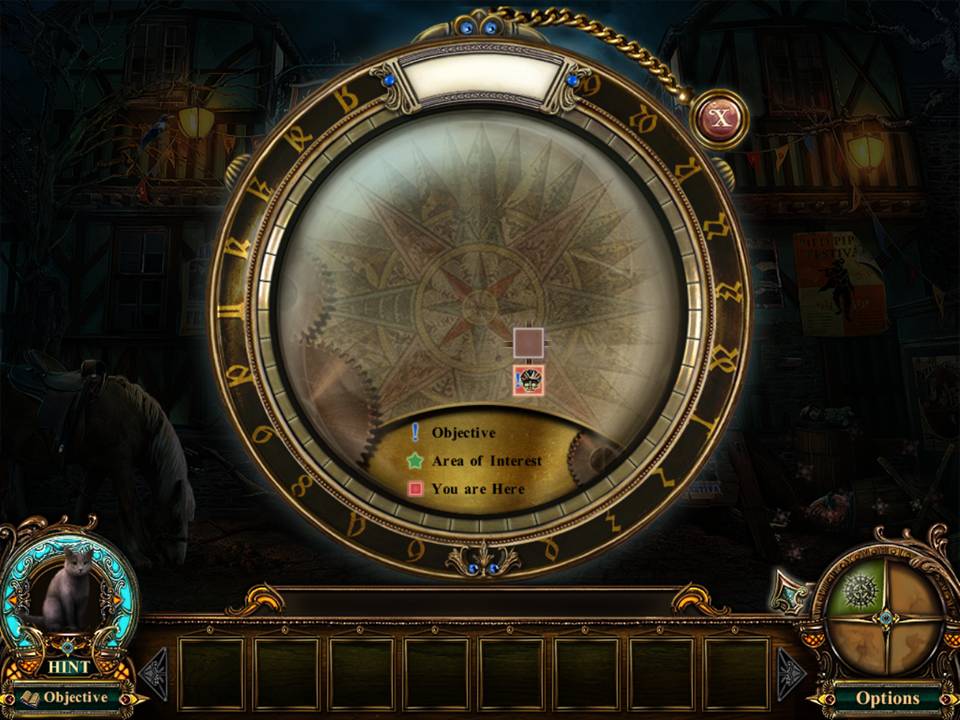 Map - This can be accessed by clicking on the button in the lower right hand part of your screen. Select the Compass icon to view the map. The circle on the bottom right corner contains items for your use (once found). The Raven icon gives you the Ravenlore Whistle. The key icon gives you the Skeleton Key. The rat icon gives you the Pied Piper’s Flute.