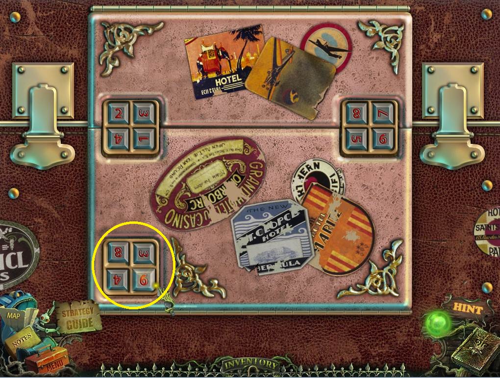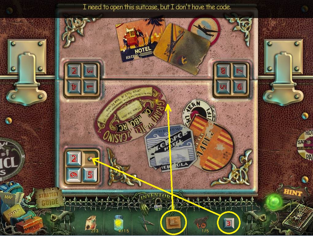 - Click on the suitcase and then put the CODE down and the BUTON in the empty slot.