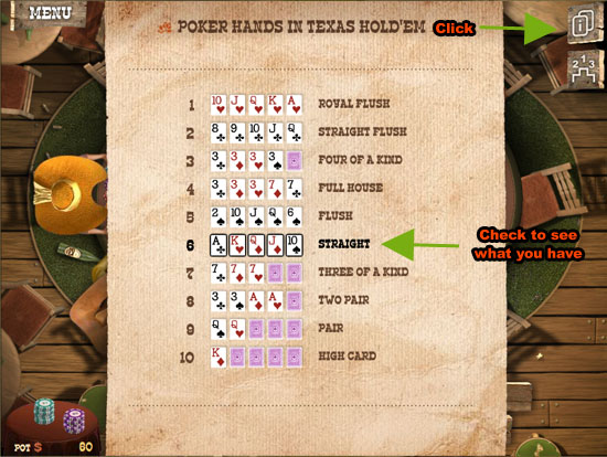 It's a good idea to become familiar with what hand beats what in Governor of Poker 2. Here's a quick list of hands you should know. You can also access this list in the game by clicking on the top right hand corner with the "i" icon.