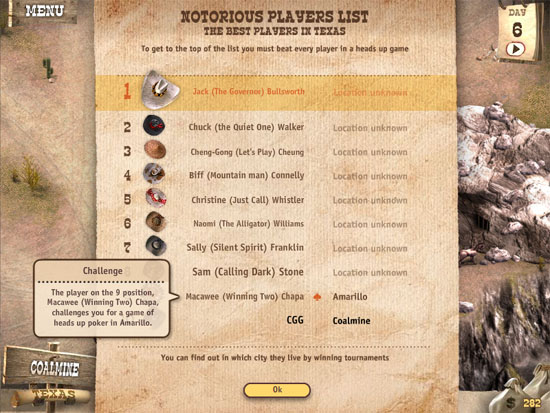 Tip: I recommend focusing on owning the majority if not all of the cities first before attempting to track down all the notorious players. Once you own all the cities, you'll have plenty of daily income to play poker on the various forms of transportation and the various mines.