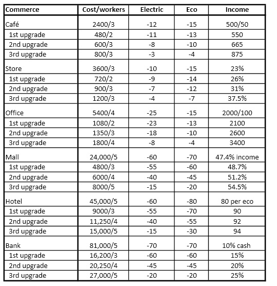 - Don't forget to place eco constructions touching housing to increase rents. This doesn't work for commerce or electrical buildings.