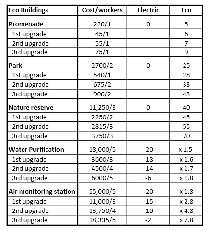 - Eco constructions include promenades (vertical and horizontal), parks, and nature reserves. All this do is boost the number of points. They do not require electricity to run.