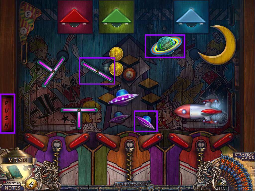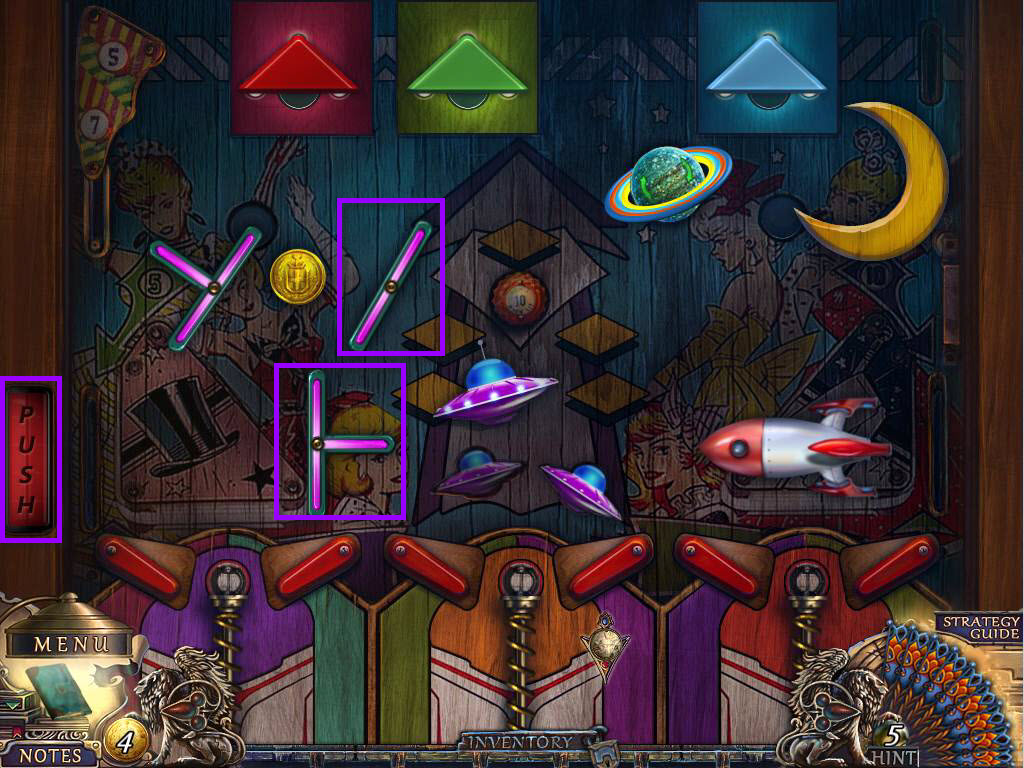 - Move the items as shown on the screenshot and them click push to shoot the ball into the red pouch.