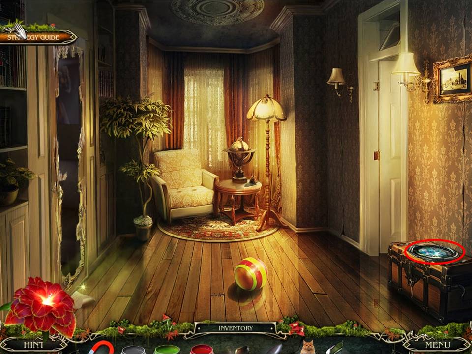 - Go back through the doorway to the upstairs foyer and use the STAINED GLASS on the trunk to the right to set up a puzzle.