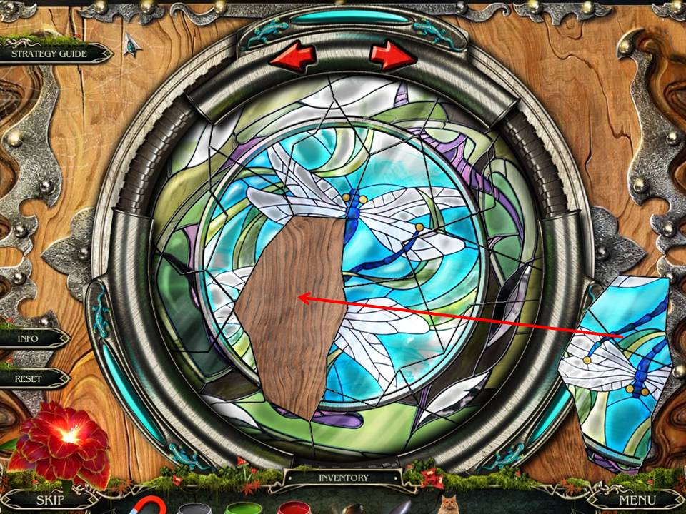 - Using the red arrows to rotate the puzzle, assemble the pieces to create the finishes picture seen in the screenshot, which shows the last piece in position to be inserted.
