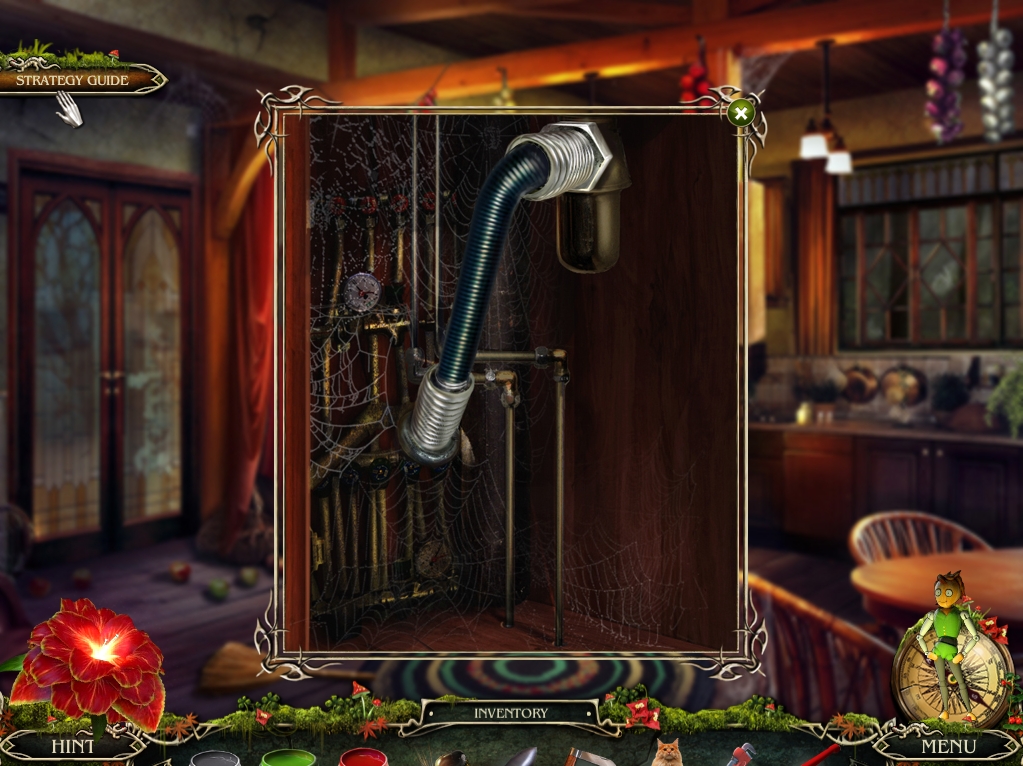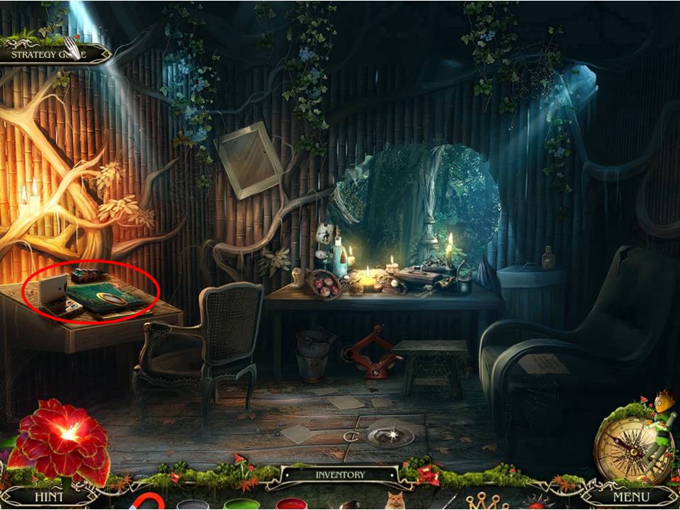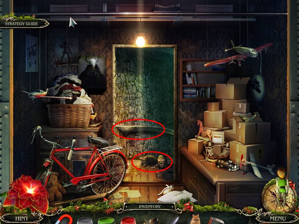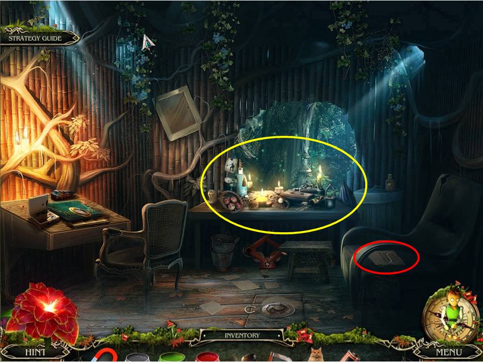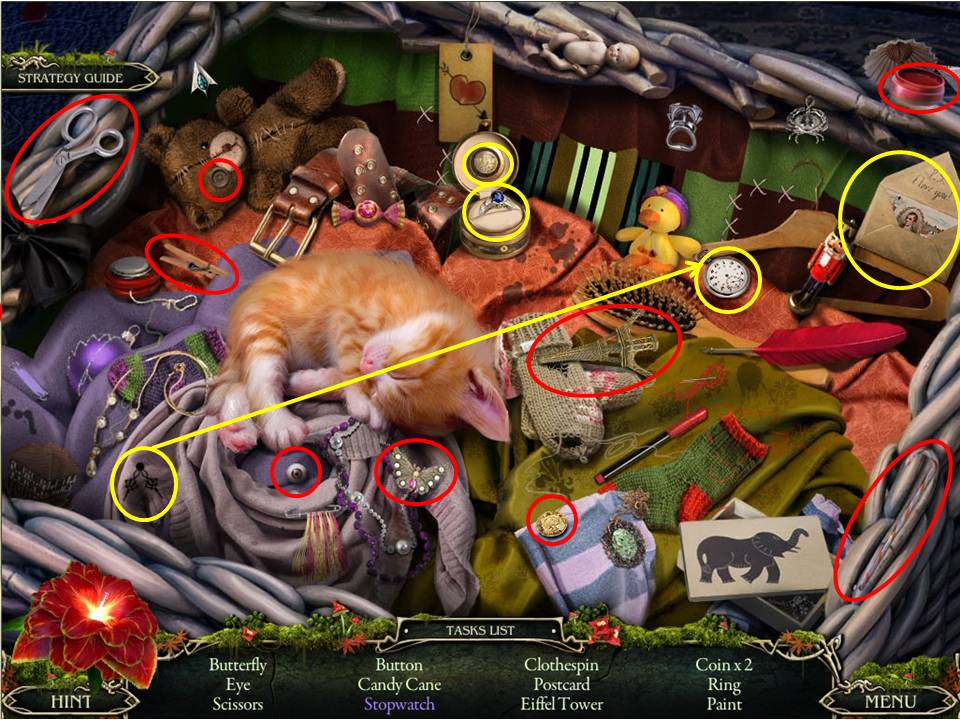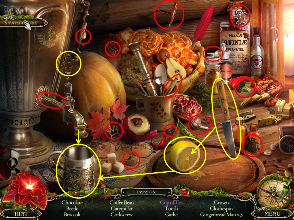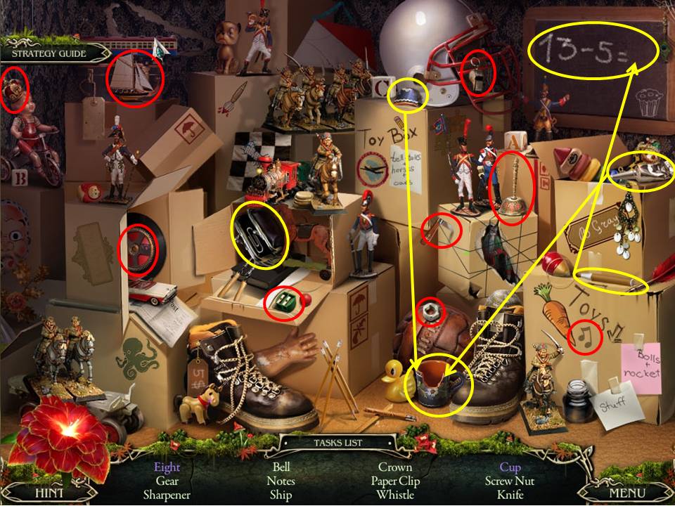 - Those circled in yellow require the follow actions – complete the equation on the chalkboard to obtain the 5, glue the chipped piece back in place to take the cup, and open the purse to reveal the paper clip inside.