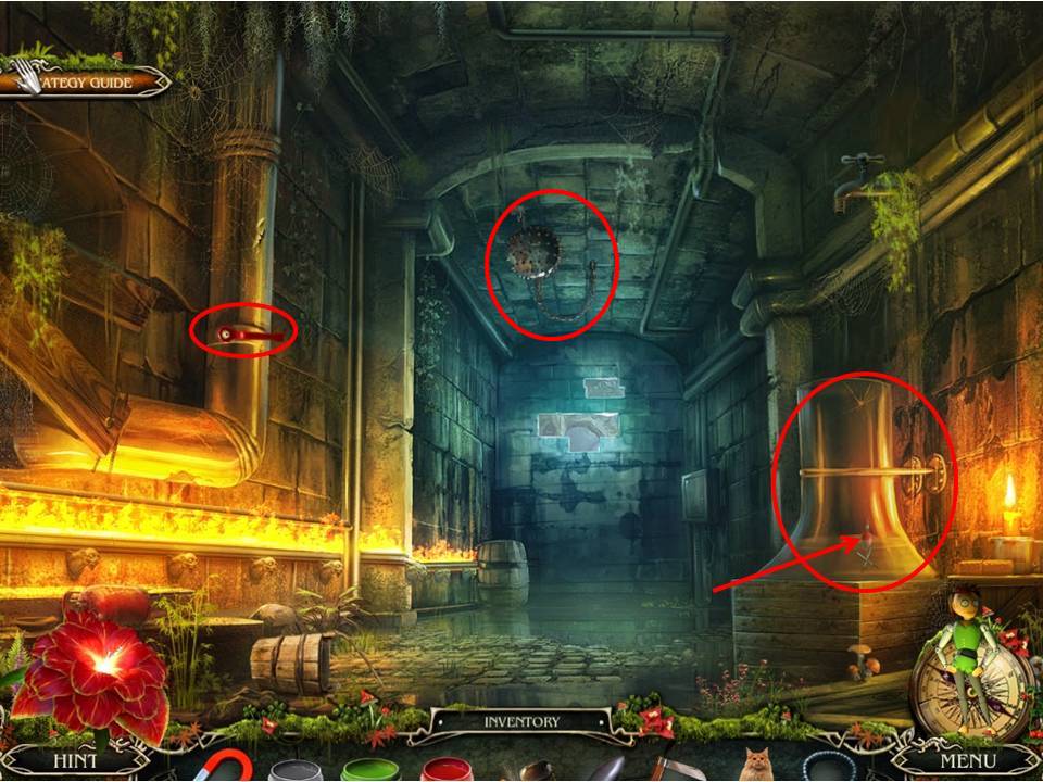- Use FLUFFY to chase away the rats, then use the FLINT on the oil trough to light the way through the passage.