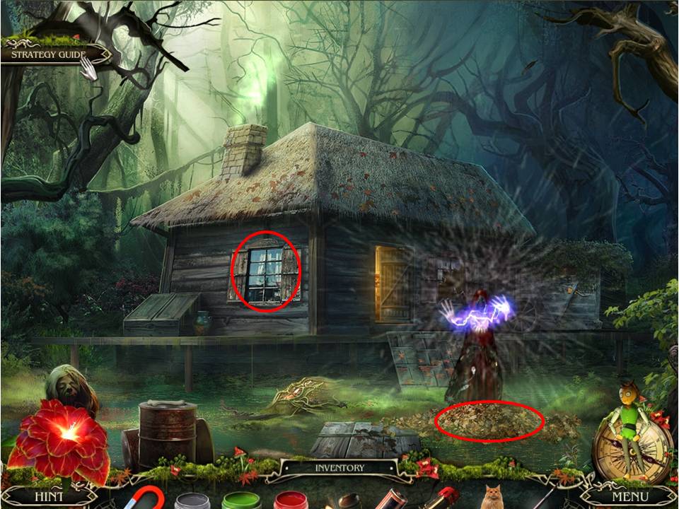 - Glance at the window, then use the FLINT to set fire to the pile of leaves.