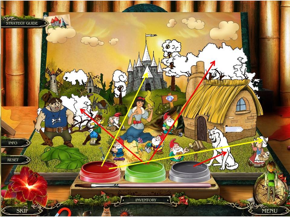 - Use the paints to complete the scene from the book, noting the accompanying screenshot for guidance regarding colors and placement.