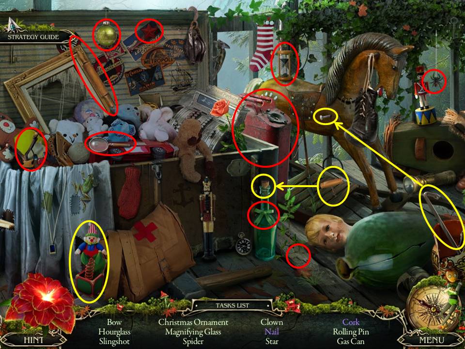- Multiple-move items include using the corkscrew to obtain the cork, finding a clown inside a box, and using a crowbar to pull the required nail from the rocking horse.