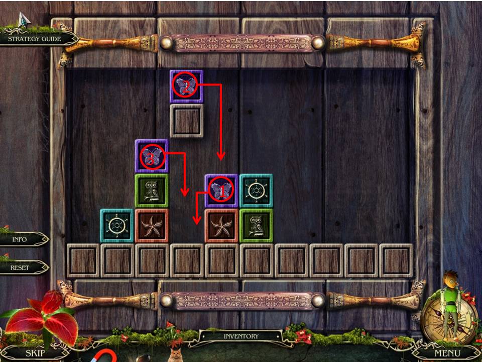 - To solve the puzzle move the items in the following order – R3x3, R1x7, R3x9, R1x3, R2x3, R3x5, Px5.