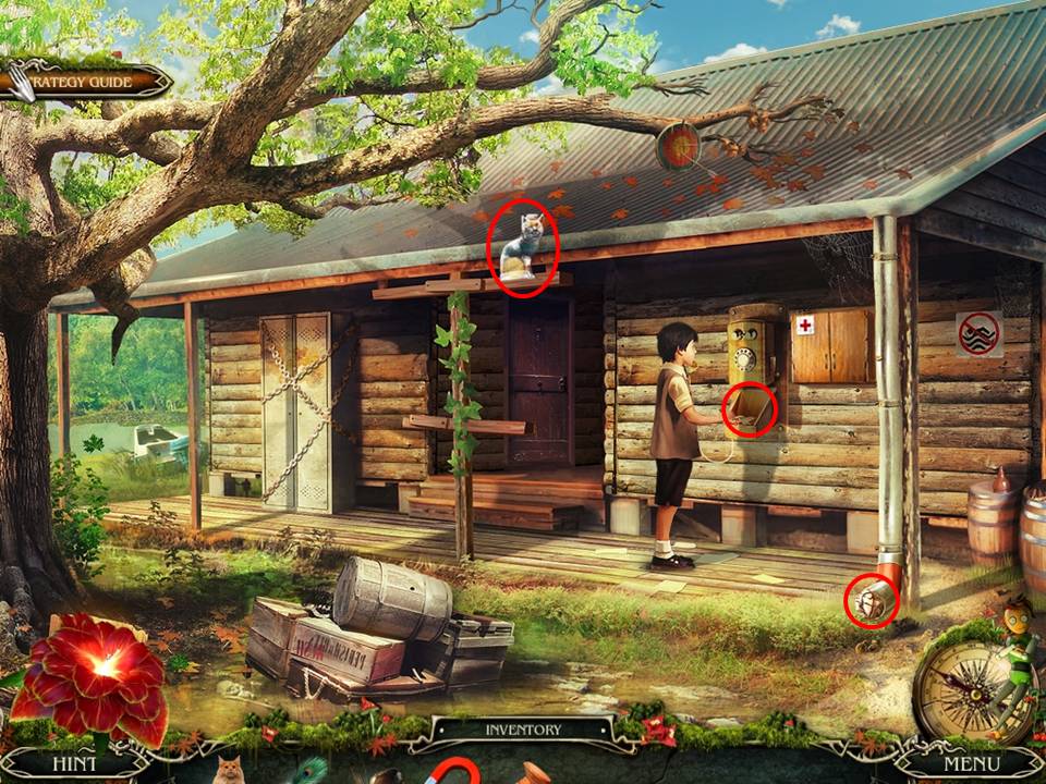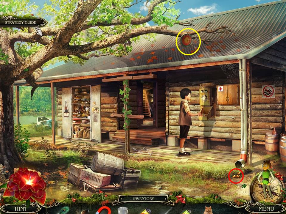 - Proceed to the cabin and use the CHARGED BOW on the target hanging above on the tree branch.
