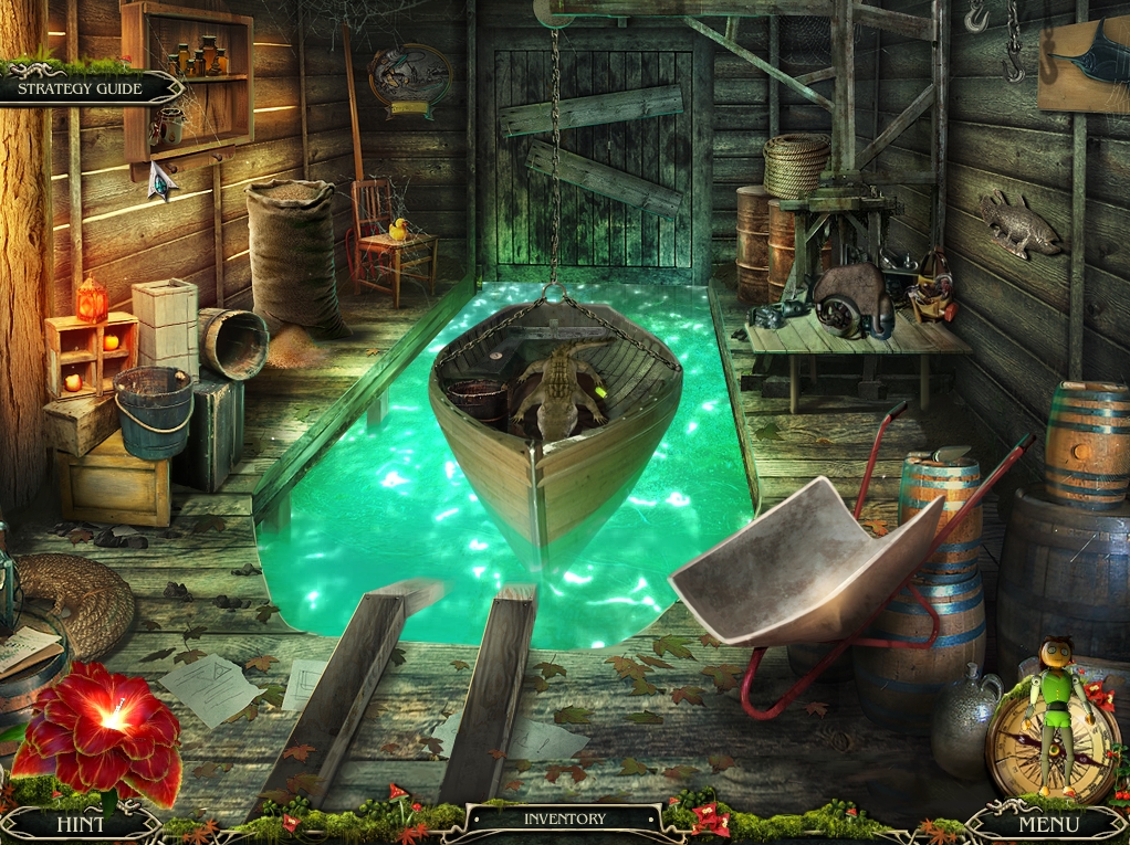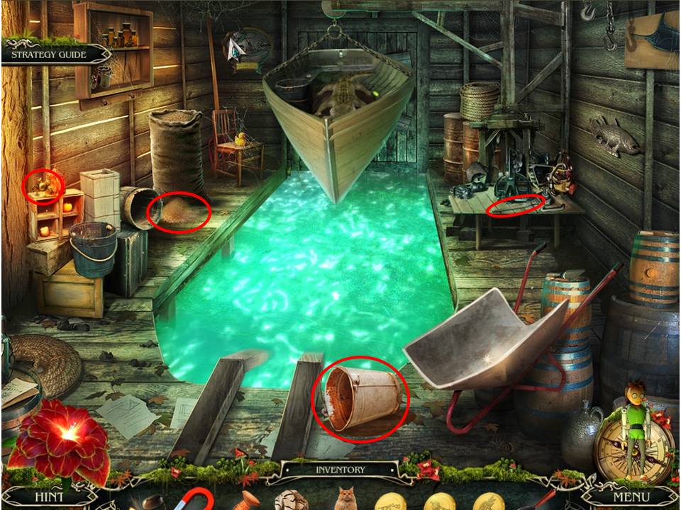 - Return to the pier and use the EMPTY BUCKET to retrieve a BUCKET OF WATER from inside the water-logged boat.