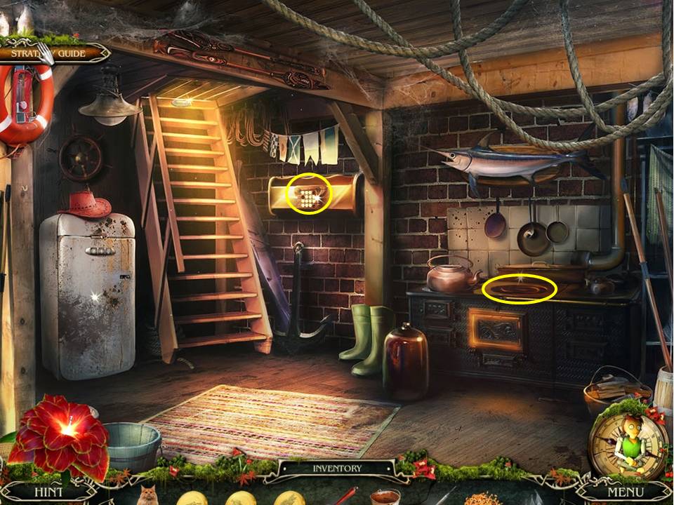 - Then take a look at the boat down by the dock, and pick up the COIN you’ll find dockside, as well as a STEERING WHEEL.