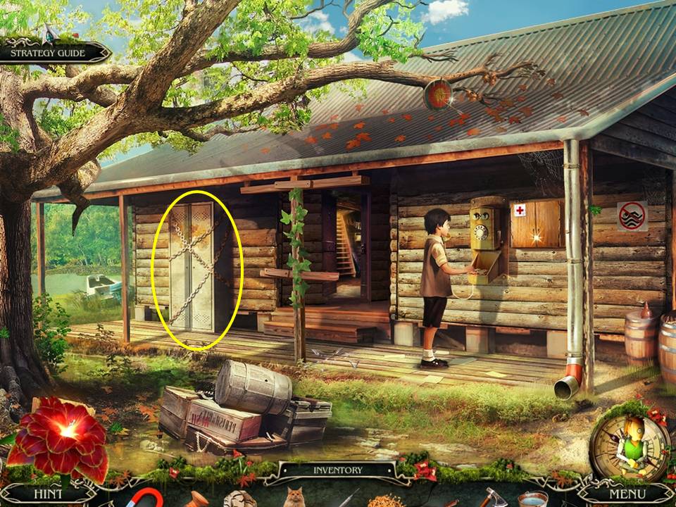 - Move to the cabin and use the FILE to cut away the chain on the cabinet.