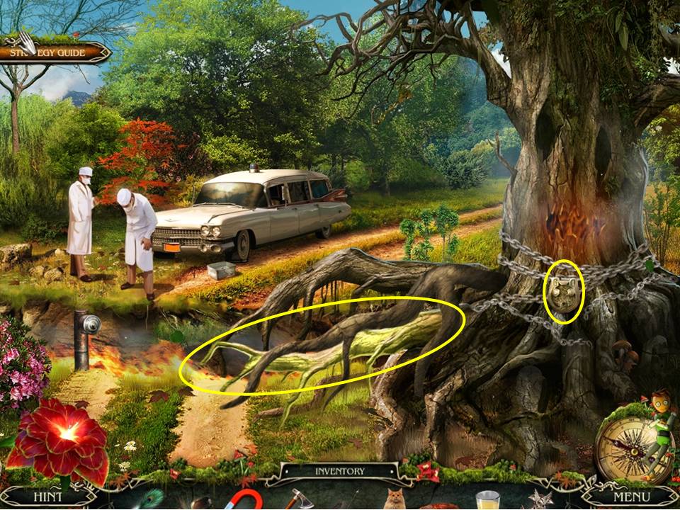 - Proceed toward the tree and place the DRAGON AMULET on the lock around the tree, then use the AXE to cut away the demon’s root.