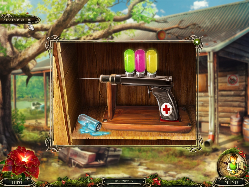 - Return to the cabin, open the medicine chest on the wall, and place the three colored VIALS from inventory in the syringe gun and take the resulting ANTIDOTE.