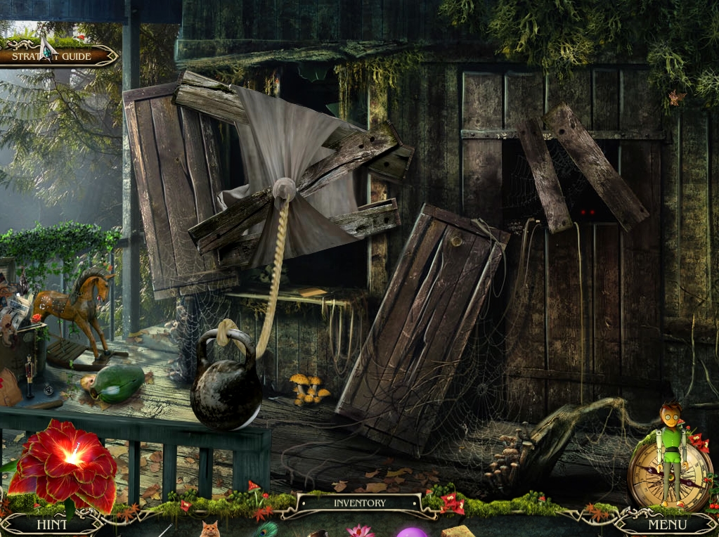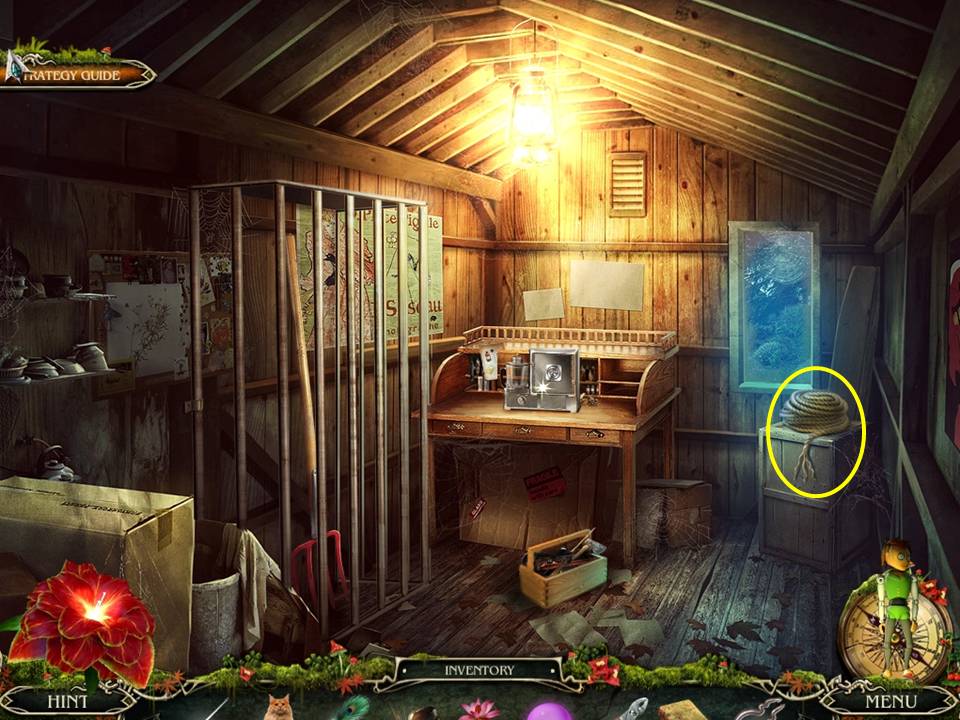 - Go up to the tree-house, click on the curtains on the boarded up window to knot them, then attach the ROPE from inventory, which will automatically tie the other end to a weight sitting on a nearby railing.