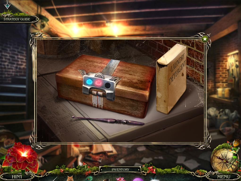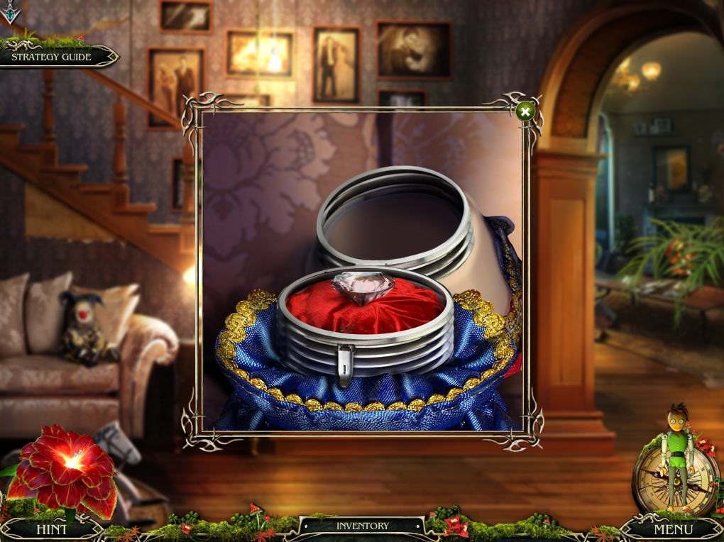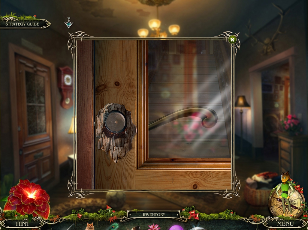 - Go the entry hall of the house, and place the two MEDALLIONS from inventory on the doll. OIL latch with the SPONGE, open it, and take the DIAMOND inside.