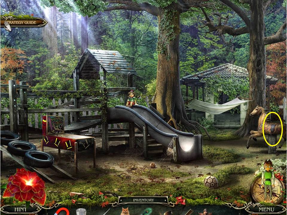 - Go to the playground in the background, zoom in on the hobby horse, place the ZIPPER PULL on the saddlebag, and take the GLASS found inside.