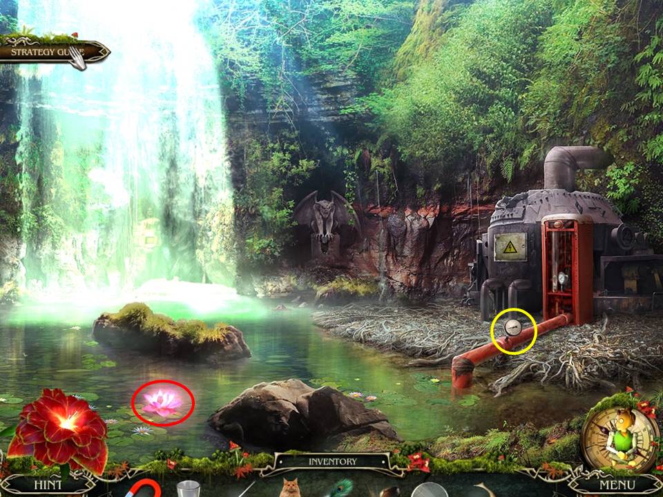 - Go back to the swamp, watch the resulting scene play out, then head to the waterfall where you’ll find a broken gauge.