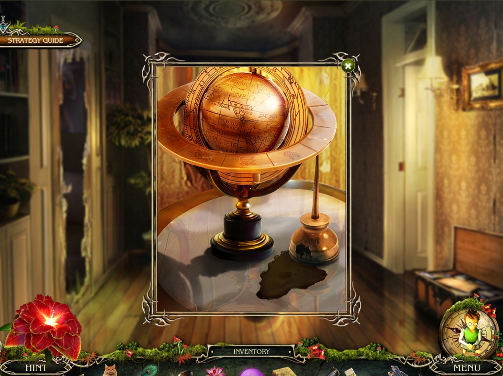 - Exit the room to the second floor landing and examine the globe sitting on the table by the chair.
