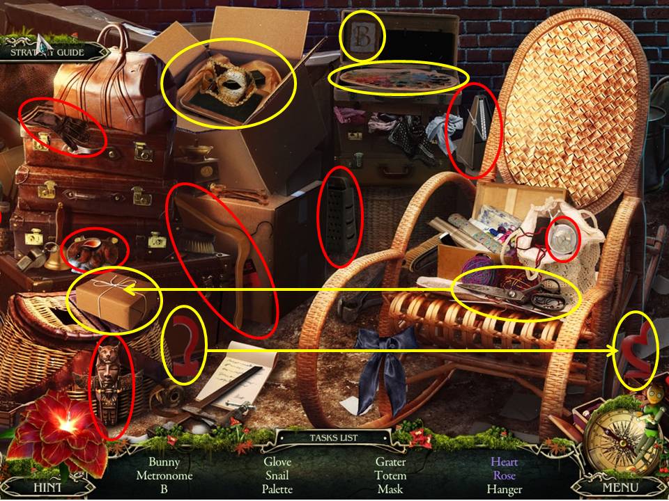 - Multi-move items include combining the two heart segments, obtaining the mask from the box, getting the B and the pallet from inside the suitcase, and using the scissors to cut the rose free.